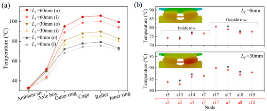 (a) Temperatures at outside row (o) and inside row (i) of ABB with = 0, 30, 60 mm; (b) temperature at thermal nodes of bearing roller with = 0 and 30 mm ( = 300 km/h).