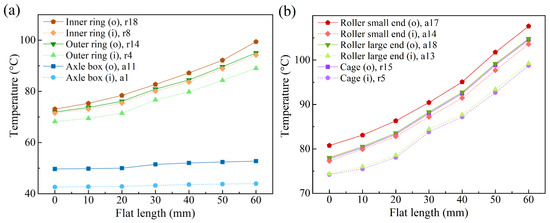 Temperatures of (a) axle box, outer ring, and inner ring, and (b) roller and cage, with different wheel flat lengths ( = 300 km/h).