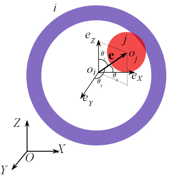 If θX, θY, and θZ are used to represent the collision azimuths of the spherical joints containing clearances, and eX, eY, and eZ represent the eccentricities in various directions, that is, the angles and eccentricities between the normal direction of the contact element and the global coordinates X, Y and Z; the mathematical expression can be obtained from Figure 2.