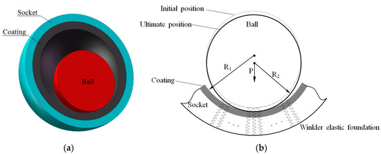 where represents the equivalent elastic modulus of the double elastic layer, , and , respectively, represent the equivalent elastic modulus of the coating and elastic modulus of the base, and , respectively, represent Poisson’s ratio of the coating and base, and lc and ls represent the thickness of the layer and base in millimeters. R1 and R2 represent the ball’s radius and the spherical shell’s inner radius. The 3D physical model of the spherical joint with clearance and coating is shown in Figure 4a, and the contact model with a double elastic layer is shown in Figure 4b.