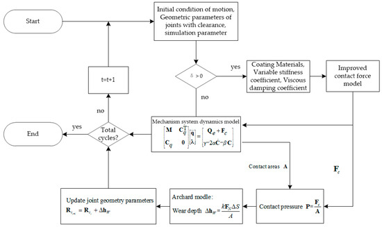 To investigate the influence of coatings and clearances on wear, polytetrafluoroethylene (PTFE) was selected as the coating material. Based on previous analysis and research of the dynamics of the mechanism containing spherical joint clearances, the wear losses of the mechanism with spherical joint clearances at different positions and with varying quantities with and without coatings were calculated. The contact force model and dynamic calculation method for the selected spherical joint clearances are the same as in [26]. The geometric parameters in the initial stage of dynamic analysis are corrected by calculating the wear depth. The corrected geometric model is then substituted into the dynamic calculation process to determine the contact state in the next step. This cycle continues until the simulation is completed. The specific analysis and calculation process is shown in Figure 5.