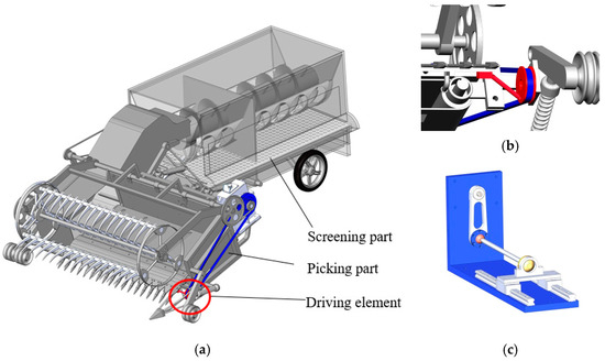 The design of the experimental platform. (a) Picking and sorting device for soybean. (b) Driving element. (c) Model building.