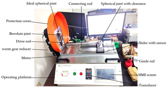 The experimental platform consists of two parts: the part above the platform (including the mechanism and testing equipment) and the part below the platform (including the driving rod (crank), connecting rod, slider, and parallel guide rail of the spatial four-bar mechanism). The deep groove ball bearing and grease lubrication are used to rotate the driving rod. The crank is connected to the frame, and the connecting rod is connected to the slider through ideal spherical joints and the spherical joints containing clearances, respectively. The length of the parallel guide rail is 1.5 times the maximum sliding distance. The motor and bevel gear reducer are installed on the back side of the crankshaft. The driving rod is driven by a stepper motor and outputs torque through a worm gear reducer. The spindle is equipped with a photoelectric sensor PX1, and the spindle speed is displayed in the frequency converter, as shown in the diagram.
