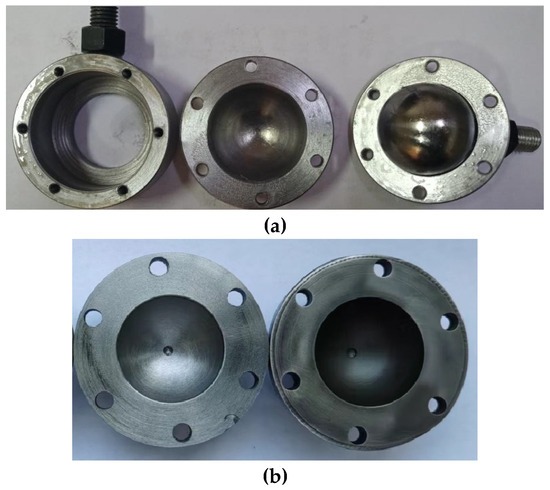 The selection of coating materials in the mechanism joints containing clearances depends on the system’s speed, external load, and actual operating conditions. Our experimental study mainly considers applying coatings at the joints containing clearances to achieve vibration reduction. Moreover, to meet the typical operation requirements of the experimental platform with coatings, the coating material should also have good lubrication properties. At the same time, to prevent relative slip between the coating and the substrate material, the selected coating material also needs to present good adhesion during the coating preparation process. PTFE (polytetrafluoroethylene) is an excellent anti-wear and self-lubricating material with outstanding wear resistance, low friction coefficient, and thermal stability, which can improve the self-lubricating and anti-wear properties of metal surfaces. Therefore, in our work, the PTFE polymer is used as the coating material to test the dynamic performance of the mechanism containing both coatings and clearances while ensuring the lubrication and adhesion of the spherical joint coating. The test results are compared with the numerical simulation results to verify the effects of joint clearances on the mechanism dynamics and the effectiveness of coatings in reducing system vibration, as discussed above. The structure of the spherical joints containing clearances is shown in Figure 9a, and the comparison before and after applying coatings to the inner surface of the shell is shown in Figure 9b.