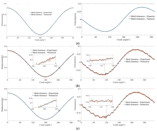 Numerical simulation was conducted for the space four-bar mechanism (RSSP), and the geometric dimensions of various components of the experimental platform are shown in Table 5. In the following three conditions—small clearances, big clearances, and clearances with coatings between spherical joints—the changes in displacement and velocity at the slider’s center of mass over one cycle are compared with the experimental results, as shown in Figure 10. It can be seen that when there are clearances or clearances with coatings between spherical joints, under the interference from electrical signals and the natural frequency of components, the differences between the experimental results and the simulation results of the slider displacement and velocity are minimal. If the effects of cumulative error (e.g., the vibration of the experimental platform and the interference of data signals) are not considered, the displacement and velocity changes of the slider can be regarded as consistent with the numerical simulation results. This conclusion is consistent with the previous conclusion that the spherical joints containing clearances have a relatively small impact on the displacement and velocity of the system actuator. It should be noted that when there are clearances and coatings between spherical joints, the fluctuation of the slider speed is slightly smoother compared to the ideal spherical joints and to when only clearances (without coatings) are considered for the spherical joints, which is consistent with the conclusion of numerical simulation.