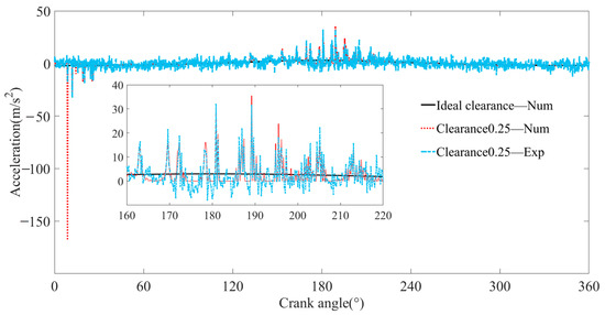As the end actuator of the space four-bar mechanism, the acceleration change of the slider can best reflect the dynamic performance of the mechanism. In order to verify the previous conclusion about the influence of clearances and coatings of spherical joints on the dynamic performance of the mechanism, the ideal spherical joints at the connection between the slider and the connecting rod are replaced with spherical joints with big clearances but no coatings and spherical joints with big clearances and coating. Similarly, the method used to evaluate the dynamic performance of the mechanism when there are clearances in spherical joints is used for numerical simulation. The simulation parameters are shown in Table 6. For the following three types of spherical joints—spherical joints with ideal clearance, spherical joints with clearance of 0.25 mm, and spherical joints with clearance of 0.25 mm and coatings—the changes in acceleration at the slider’s center of mass are compared with the comparison results shown in Figure 11 and Figure 12, respectively.