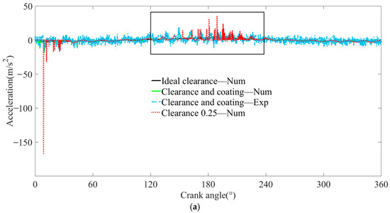 According to Figure 11, when the clearance between the spherical joints is ideal, the acceleration change of the slider is affected by the reaction force of the joint. The acceleration is a continuous non-zero curve except for the start and end positions. When the spherical joints contain clearances, the numerical solution of the slider acceleration exhibits intermittent abrupt changes, with some positions showing zero acceleration. However, the overall change trend is consistent with the numerical results for the spherical joints containing ideal clearance. This is mainly because the sphere is instantly in a free state during contact and collision and is not subjected to external forces, resulting in 0 acceleration. Compared with the numerical results for spherical joints containing clearances, zero acceleration was not detected in the experiment. Considering the accumulation of various errors and signal interference during the experiment, the overall change trend of the acceleration experimental results at the slider’s center of mass can be regarded as consistent with the numerical results. Therefore, the acceleration test results of the slider can prove the correctness of the contact force model proposed earlier for the spherical joints with clearances, as well as the conclusions about the influence of the spherical joint clearances on the dynamics of the mechanism. When considering both clearances and coatings for the spherical joints, the acceleration change curve at the slider’s center of mass in a single cycle is shown in Figure 12, and the enlarged acceleration curve of the slider when the crank rotates to the range of 120~240° is shown in Figure 12b. When there are clearances and coatings in the spherical joints, the overall trend of the acceleration change at the slider’s center of mass is consistent with that of the spherical joints containing ideal clearances. The amplitude is slightly reduced compared with the numerical results of spherical joints with clearances and no coatings. Considering the effects of various errors during the experiment [25], the experimental results can be regarded as consistent with the numerical results.