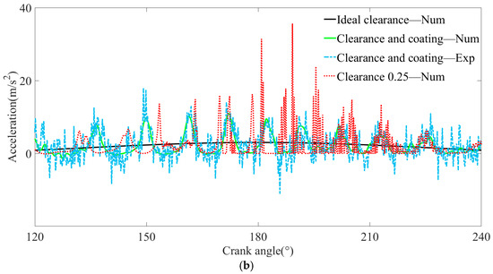 Acceleration of the slider with clearance and coating. (a) Crank angle 0~360°. (b) Crank angle 120~240°.