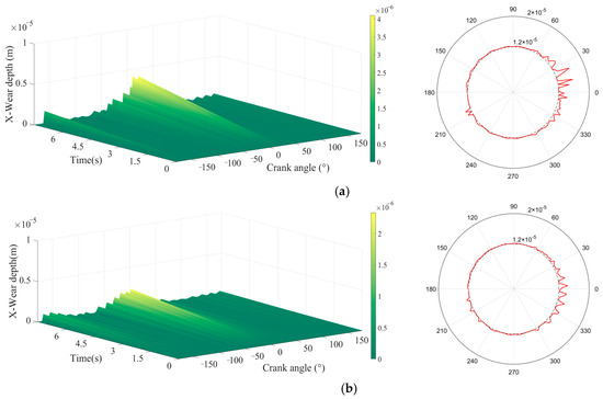 In contrast, the maximum wear depth in other wear areas decreases compared to the joint without coating. This is mainly due to the randomness in the contact collision process and the cumulative error in the experimental method. The average of the other three sets of measurement values can be used as a substitute for parameter comparison in the later stage. The completeness and reliability of experimental data will be gradually improved in our future research work. Similarly, the system dynamics calculation and wear prediction methods for the mechanism containing spherical joint clearances and coatings are adopted to predict the wear depths when the spherical joint clearances are with and without coatings, with the prediction results shown in Figure 13a and Figure 13b, respectively. It can be seen that when the clearance between the spherical joints is 0.25 mm, adding coating can reduce the maximum wear depth on the inner surface of the shell, which is consistent with the prediction of spherical joint wear when the spherical joint clearance is 0.5 mm in [29].