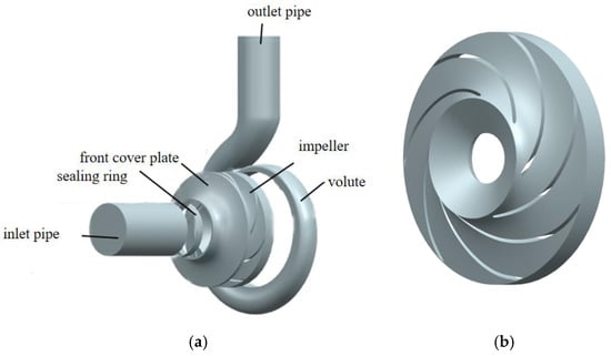 Figure 1. (a) Modeling of main parts of centrifugal pump. (b) Impeller model.