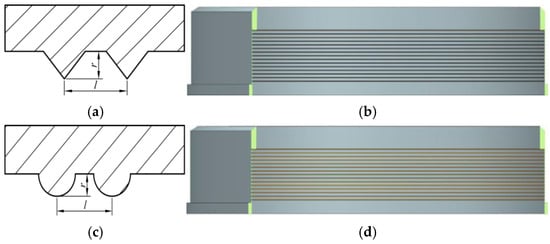 Figure 2. Hydraulic model of bionic surface structure sealing ring. (a) V-groove profile diagram. (b) Three-dimensional model of V-groove. (c) Circular groove profile diagram. (d) Circular groove profile diagram.