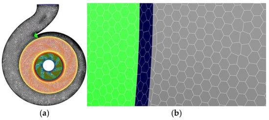 Figure 3. Mesh subdivision. (a) Centrifugal pump overall grid. (b) Sealing ring gap grid.