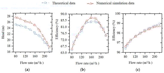 Figure 4. Pump characteristic curve. (a) Flow–head comparison curve. (b) Flow–efficiency comparison curve. (c) Flow–volume efficiency comparison curve.