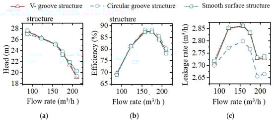 Figure 6. Pump characteristic curves of sealing rings with different surface structures. (a) Flow–head curve. (b) Flow–efficiency curve. (c) Flow–leakage curve.