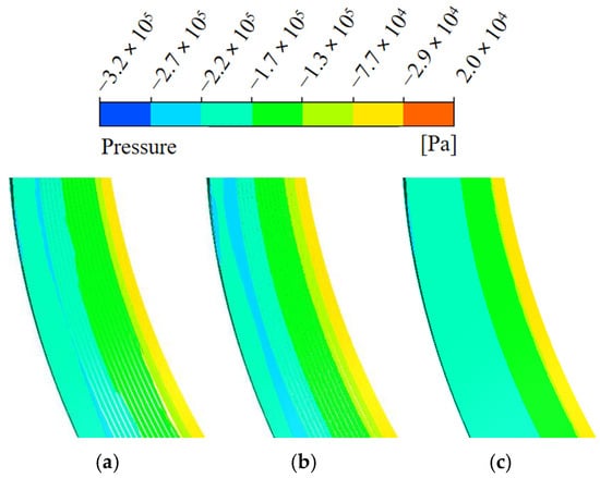 Figure 7. Pressure distribution cloud chart of different sealing ring structures. (a) V−groove structure sealing ring. (b) Circular groove structure sealing ring. (c) Smooth surface sealing ring.