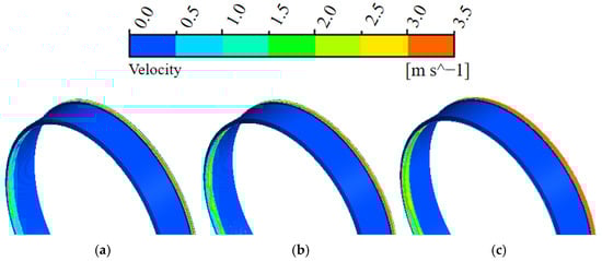 Figure 8. Velocity distribution nephogram of sealing rings of different structures. (a) V−groove structure sealing ring. (b) Circular groove structure sealing ring. (c) Smooth surface sealing ring.