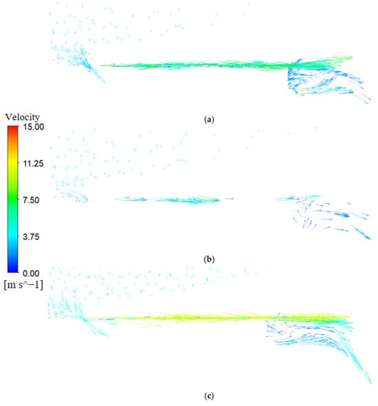 Figure 9. Velocity vector diagram of seal rings with different structures on X = 0 datum plane. (a) V−groove structure sealing ring. (b) Circular groove structure sealing ring. (c) Smooth surface structure sealing ring.