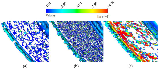 Figure 10. Vortex diagram of sealing rings with different structures at 175 m3/h. (a) V−groove structure sealing ring. (b) Circular groove structure sealing ring. (c) Smooth surface sealing ring.