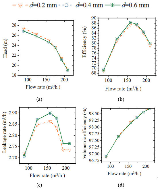 The pump characteristic curves of circular groove seal ring pumps with different diameters (d) are shown in Figure 12. It can be clearly seen from Figure 12a that, with the increase in flow rate, the head of the centrifugal pump with a circular groove structure will decrease rapidly. Among them, the curve trends of 0.4 mm and 0.6 mm in diameter are almost the same, but the head at each flow stage is weaker than that at 0.2 mm in diameter. It can be seen from Figure 12b that the flow–efficiency curves of the three circular groove structures with different diameters are almost the same. After the flow reaches a certain value, the efficiency of the circular groove structure with a diameter of 0.2 mm is greater than that of the two structures with diameters of 0.4 mm and 0.6 mm and, as the flow continues to increase, the downward trend in efficiency is also smaller than that of the other two structures. Figure 12c is the relationship between the leakage of the sealing ring of the circular groove surface structure with different diameters and the flow rate. It can be seen that the leakage of the sealing ring of the circular groove surface structure with three diameters first increases with the increase in the flow rate, then decreases and finally tends to be stable. Comparing the leakage of the sealing rings of the three structures, it can be seen that the leakage of the sealing ring of the circular groove surface structure with a diameter of 0.2 mm is the least among the three structures. Figure 12d shows the relationship between the volume efficiency of the sealing ring and the flow rate of the circular groove surface structure with different diameters. The volume efficiency trend of the three structures is the same, which increases with the increase in the flow rate. The volume efficiency of the circular groove surface structure seal ring with a diameter of 0.2 mm is slightly larger than that of the circular groove surface structure seal ring with a diameter of 0.4 mm and that of the circular groove surface structure seal ring with a diameter of 0.6 mm. The volume efficiency of the ring means that the circular groove surface structure seal ring with a diameter of 0.2 mm has the strongest sealing performance. Under different flow rates, the sealing performance of the circular groove structure is relatively optimal when the diameter is 0.2 mm.