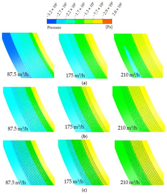 Figure 13. Under the condition of flow rate of 87.5 m3/h, 175 m3/h and 210 m3/h, the pressure cloud diagram of circular groove sealing ring with different diameters. (a) d = 0.2 mm. (b) d = 0.4 mm. (c) d = 0.6 mm.