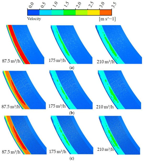 Figure 14. Under flow rate conditions of 87.5 m3/h, 175 m3/h and 210 m3/h, the velocity cloud diagram of circular groove seal ring with different diameters. (a) d = 0.2 mm. (b) d = 0.4 mm. (c) d = 0.6 mm.
