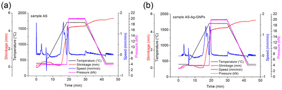 Representative temperature, shrinkage, and pressure cycles during the SPS process of the samples AS (a) and AS-Ag-GNPs (b).