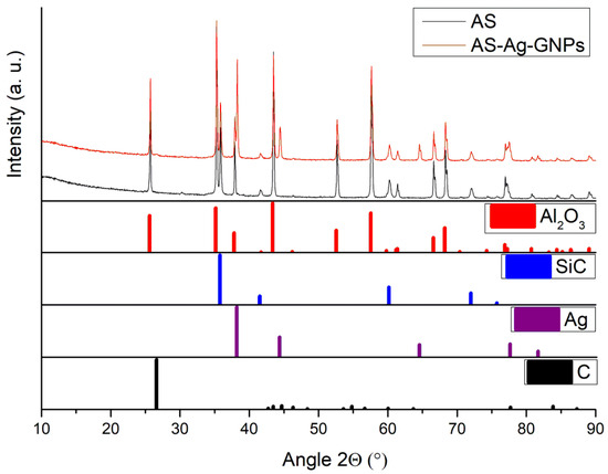 Two sintered samples of AS and AS-Ag-GNPs analyzed by XRD were compared in order to determine the difference in their phase compositions (Figure 2). Results of the evaluated data show that, as expected, both samples contained roughly similar amounts of cubic β SiC (PDF—01-073-2084) and hexagonal α Al2O3 (PDF—00-042-1468). In the sample, AS-Ag GNPs were detected as silver with cubic Fm-3m phase (PDF—00-004-0783). The presence of GNPs was also detected; the fit was based on carbon hexagonal structure (PDF—00-026-1076), yet its presence is determined only by reflection (002) 2 θ° = 26.6°.