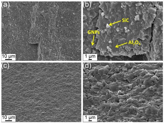 The microstructures of sample AS for the comparison and AS-Ag-GNPs prepared by the SPS were observed through SEM-BSE. The morphology results are presented in Figure 3. SEM micrographs of the fracture surfaces (Figure 3) show that the composite exhibits a well-densified structure in its final form. A uniform distribution of Ag and GNPs within the matrix was observed, with no evidence of porosities or cracks. This uniformity is attributed to the pressure-assisted sintering process, which ensures proper solidification of the composite. Small GNP agglomeration is observed in the microstructure, although some of the platelets are pulled out of the matrix during polishing (the reason for showing fracture surfaces). The high magnification microstructure of the sample without Ag and GNPs (Figure 3b) shows large Al₂O₃ (dark) grains and SiC (gray) particles sintered together. The addition of 5 wt.% Ag and 0.5 wt.% GNPs (Figure 3d) altered the morphology of the Al₂O₃-SiC matrix, resulting in slightly finer grains with a near-spherical shape, transitioning to larger plate-like grains. Figure 3d also illustrates the GNPs located at the grain boundaries, forming interfaces with varying orientations.