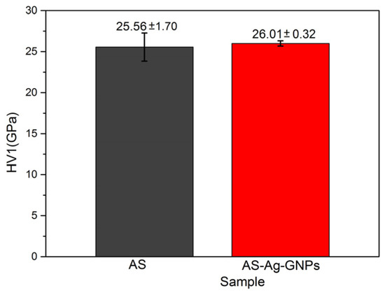 The mechanical properties are influenced by both phases and grain boundaries, contributing to the increase in microhardness (Figure 4). The microhardness of the AS reference material was about 25.56 ± 1.7 GPa. The microhardness of the AS-Ag-GNPs composite increased to about 26.01 ± 0.3 GPa. The microhardness of composite sample AS-Ag-GNPs was slightly higher than that of reference AS. The small increase in hardness could be attributed to the incorporation of the strengthening secondary GNPs phase into the matrix.