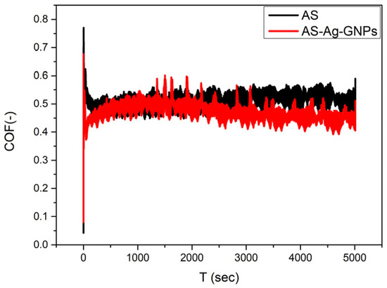 COF vs. time graph of the samples AS and AS-Ag-GNPs at a reciprocal speed of 0.1 m/s, length of 500 m, and friction force of 2 N, obtained from tests under dry sliding conditions.