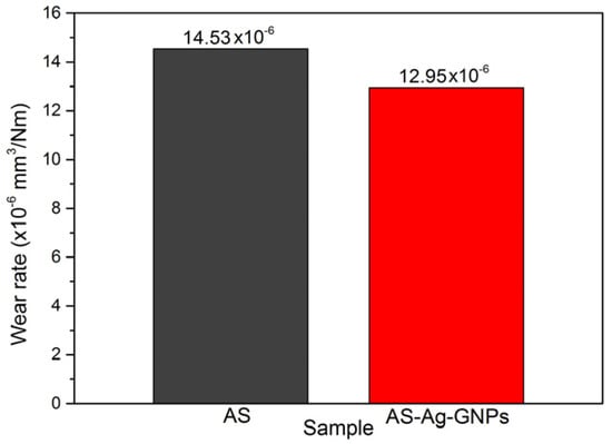 Figure 6 shows the variation in the specific wear rate of AS and AS-Ag-GNPs samples. In the sample AS-Ag-GNPs, there is a reduction in the specific wear rate due to adding the appropriate amount of Ag and GNPs in the alumina matrix.