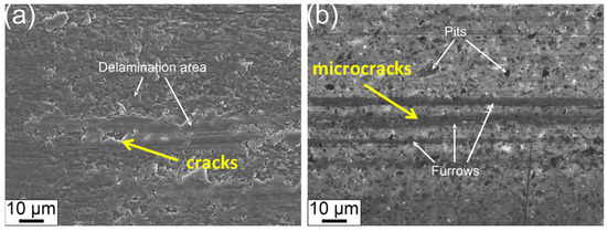 The SEM images of the worn-out surfaces of sample AS and AS-Ag-GNPs reinforced with 5 wt.% Ag and 0.5 wt.% GNPs are shown in Figure 7. During wear, the SiC ball sliding on the surface of the pure AS ceramic sample generates thermal stresses, leading to surface cracking and material delamination (Figure 7a).