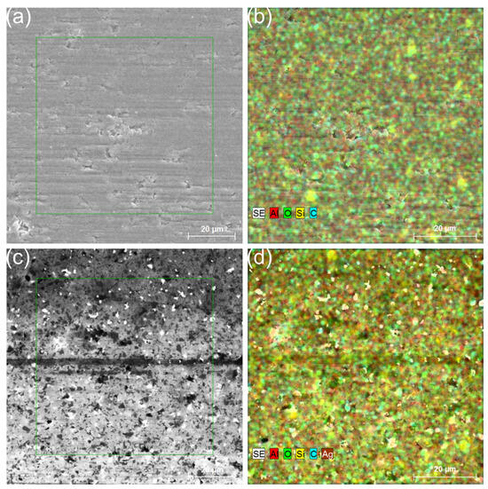 SEM microstructures and EDS maps of the samples AS (a,b) and AS-Ag-GNPs (c,d) worn surfaces after sliding at 0.1 m/s, applied load 2 N, sliding distance 500 m against a SiC ball at room temperature.