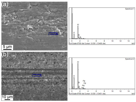 SEM microstructures supported by EDS analyses of wear tracks of the studied samples AS (a) and AS-Ag-GNPs (b).