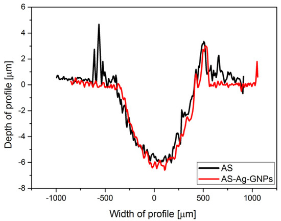 Figure 10 shows the representative wear track profiles for both samples, taken from the center of the wear tracks after dry sliding. Abrasive wear particles were generated due to fractures in the softer Al2O3-SiC matrix material when interacting with the harder SiC friction partner. By nature, the latter has lower mechanical strength compared to the harder material. Fragments from the harder material were also formed and observed within the friction track, as there are local areas of reduced strength within the harder material. In the case of the AS-Ag-GNPs sample, these fragments were mixed with Ag and GNPs, leading to a reduction in wear rate and COF.