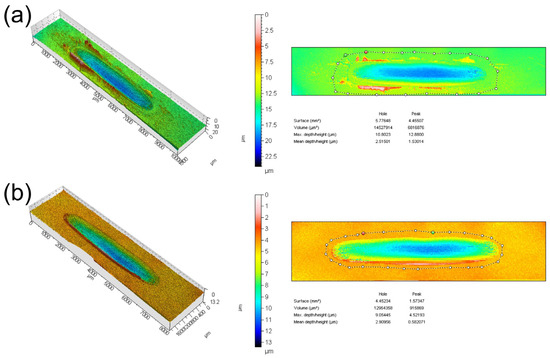 Axonometric plots of wear tracks of sample AS (a) and AS-Ag-GNPs (b) at reciprocal speed of 0.1 m/s, length of 500 m, and applied friction force of 2 N, obtained from tests under dry sliding conditions.