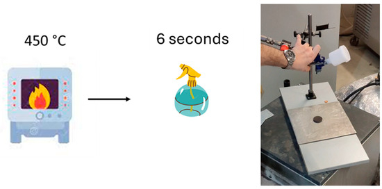 To replicate the industrial process at the laboratory, test samples were pre-heated to 450 °C in a conventional furnace for 30 min. Afterwards, the samples were removed from the furnace and immediately perpendicularly sprayed for 6 s as shown in Figure 1. To monitor the temperature and record the drop during the spraying step, a type K thermocouple was welded to the surface samples being the temperature measuring rate of 1 Hz with a sensitivity of 41 µV/K (approximately ± 0.25 °C).