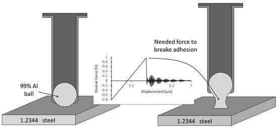 Adhesion tests were performed in the tribometer chamber at 450 °C without a controlled atmosphere according to the test configuration used in previous studies [28]. The test consisted on a ball-on-disc configuration, using a 1.2344 steel disc (industrial die-hardened steel) as a lower specimen and an 99% aluminum ball of 4 mm of diameter as the upper specimen. After a stabilization period of 30 min in the tribometer chamber, the material was brought into contact. A normal force of 10 N was applied and maintained for 30 s. Subsequently, the aluminum ball was retracted at a velocity of 50 µm/s. Throughout the test, the force was recorded at each moment. When the contact between the disc and the ball was lost, a peak in the tensile force would be registered, while force would drop to zero if no adhesion occurred. A scheme of the test is illustrated in Figure 2. After the test, the residual imprints were characterized by means of 3D optical measurement system (ALICONA InfiniteFocus SL).