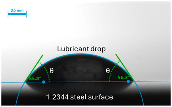 Contact angle θ measurement between a polished 1.2344 steel surface and a lubricant drop.