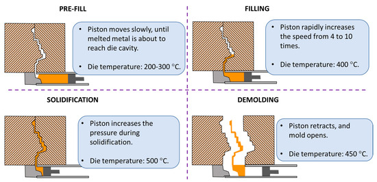 To assess the effectiveness of the newly formulated lubricants in an industrial environment, several trials were performed at the HPDC pilot plant owned by Eurecat, located at the Cerdanyola (Spain) facilities. Pilot plant trials were designed to fulfill the industrial requirements; Figure 4 shows the process scheme followed in this investigation. For the casting trials, an AlSi10MnMg alloy was used with an approximate melt temperature of 720 °C and the standard casting parameters used to produce the part, replicating the working conditions typically used to produce structural HPDC components in the industry.