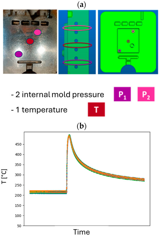 The cavity inserts of the die are made of 1.2344 steel as detailed in Table 2. The die is equipped with three sensors within the cavity: two pressure sensors and one temperature sensor. The sensor placements are illustrated in Figure 5a, where the temperature sensor is centrally located (indicated by red bullet point). This temperature sensor continuously monitors the temperature value on the die surface during each injection cycle. Figure 5b displays a typical temperature curve recorded by the sensor over 10 consecutive injection cycles. When the molten aluminum reaches the die surface, the temperature suddenly rise to 500 °C before rapidly decreasing during the solidification process. The temperature sensor demonstrates excellent repeatability across the recorded cycles.