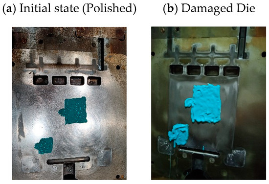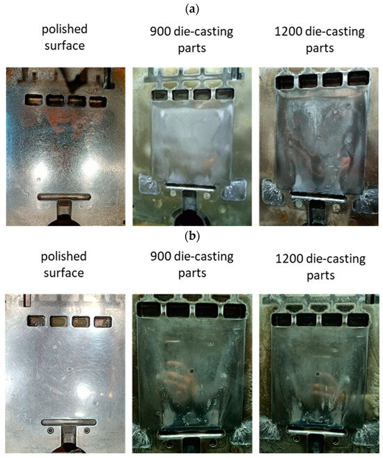 Images of the evolution of surface wear during the production of 1200 aluminum casting parts. (a) Reference lubricant; (b) newly formulated lubricant enhanced with an additive to address the Leidenfrost point (LUB 2).