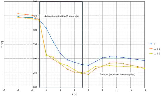 Figure 7 shows the temperature curve recorded after 1.2344 steel specimens were pre-heated at 450 °C in a conventional furnace for 30 min. Then, the lubricant was sprayed for 6 s. Each point in the graph corresponds to the experimental measured points during the lubricant spraying. It can be observed that after the preheating of 450 °C, the application of the lubricant leads to a decrease in steel surface temperature. However, following the 6 s of spraying, the temperature begins to rise again due to the lack of lubricant, which is responsible for cooling the steel specimen. It can be observed that the newly formulated ester-based lubricants have a higher heat-transfer capability in comparison with the reference lubricant (mineral-oil based).