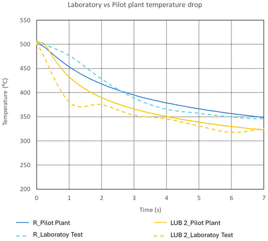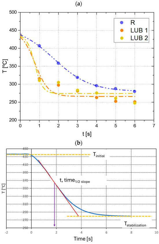 Using sigmoidal fitting, the heat-transfer capability of the lubricants have been assessed based on the slope of the fitted curve. Figure 8b illustrates a scheme of the heat-extraction-fitted curves, focusing on two main parameters. First, the slope of the curve (°C/s), which represents the temperature drop over time and is considered to be the heat-transfer capability of the lubricant, i.e., this value represents the Kinect of the lubricant during cooling. Second, the time at mid-slope, which represents the transition between the initial temperature (450 °C) and the stabilization temperature, is considered to be the efficiency of the lubricant (if more or less time is needed to reach the transition between the initial and the stabilization temperatures).