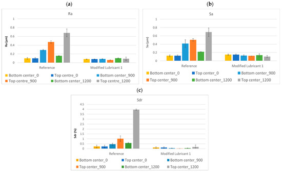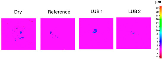 Figure 15 and Table 6 presents the experimental values obtained for the evaluated surface roughness parameters. Ra and Sa represent the roughness average in 2D and 3D, respectively, while Sdr indicates the texture’s contribution relative to a planar area; a perfectly leveled surface has an Sdr of zero, and Sdr becomes larger as the slope of the surface increases. It can be observed that the newly formulated lubricant enhanced with an additive to address the Leidenfrost point (LUB 2) significantly reduces the adhesion in the surface die, thereby reducing the surface roughness of the die, minimizing the wear, and extending the die’s service life.