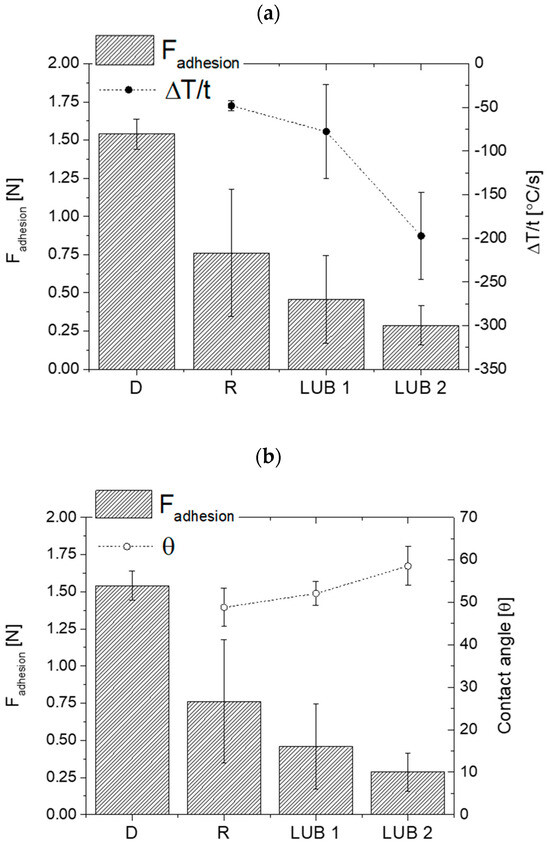 (a) Adhesion force in bars and lubricant heat-extraction capacity in dots; (b) adhesion force in bars and contact angle in open dots.