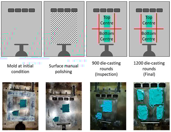 To assess the lubricant’s effectiveness in an industrial environment, experiments were performed in an aluminum HPDC pilot plant. The initial step involves a visual inspection of the die to identify areas with significant wear, corrosion and material adhesion. These identified points show where replicas were applied during the pilot plant tests. Figure 11 shows the different sections into which the die surface was divided for wear inspections during the trials. Prior to each trial, the die surface was manually polished as described in Section 2.3.