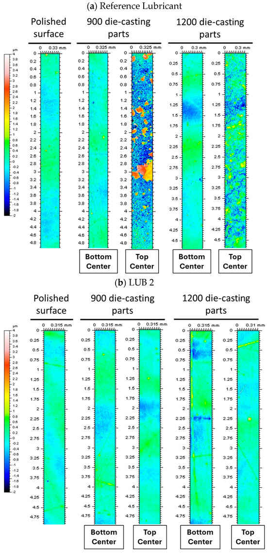 Figure 14 shows the 3D topography analysis of the surface replicas applied on the surface die during the wear inspections. It can be observed that the main wear mechanism indentified is adhesion and has a direct effect on the surface roughness. The new lubricant formulated with an anti-Leidenfrost additive appears to be significantly more effective in reducing adhesion and then improving surface die quality.
