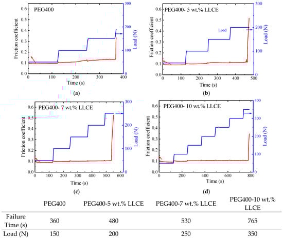 | Steel-steel friction pairs, 100 N, 25 Hz [27] | PEG400 | 0.133 | 16 | |