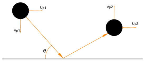 where is the normal velocity of the particles before collision (m/s), is the tangential velocity of the particles before collision (m/s), is the normal velocity of the particles after collision (m/s), and is the tangential velocity of the particles after collision (m/s).